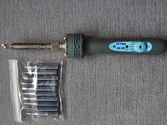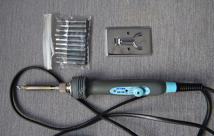 Некогда флагман в своем классе) Керамический нагреватель. Мощность: 50 Вт. Комплект: паяльник, набор жал, подставка, инструкция на английском. Из плюсов: отличный внешний вид, нескользящий пластик, возможность регулировки температуры, супер мягкий кабель с выключателем. Рукоятка во время работы не греется. 700 руб